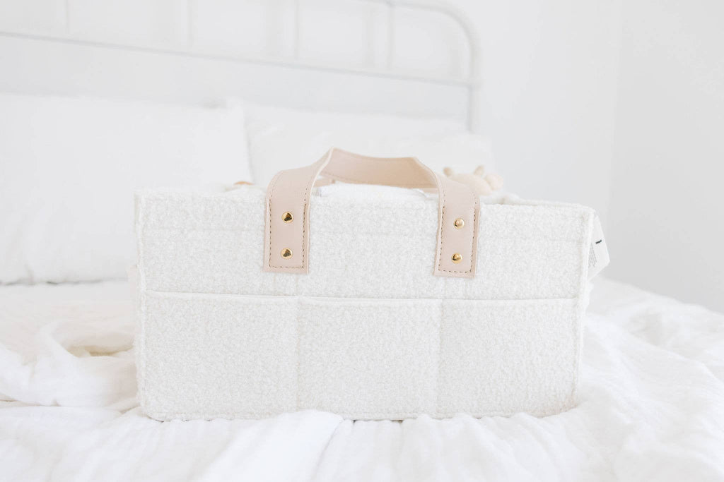 Our diaper caddy is a must have new parent item! With room to hold all of baby's essentials it's perfect to use as a changing table organizer, pumping station, or to hold diaper changing supplies in the car. The removable dividers and generous size make it easy to accommodate everything you need from diapers, wipes, creams, burp cloths, and toys to pumping supplies + bottles. The neutral cream teddy fabric and faux leather handles compliment any nursery design.