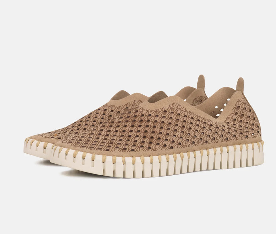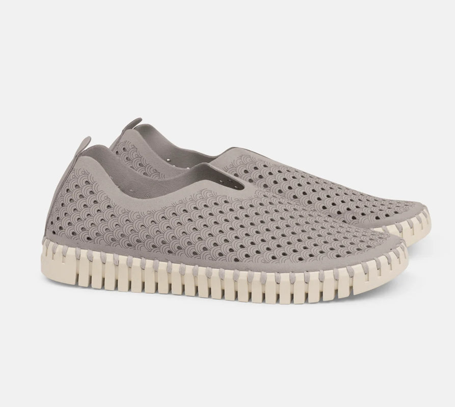 The iconic Tulip shoe, with metallic appearance, by ILSE JACOBSEN HORNBÆK. The upper is made of recycled microfiber with a decorative laser cut pattern attached to our iconic Tulip outsole. The outsole is made of 75% natural rubber and 25% recycled rubber, with match coloured recycled thread, using no glue. The insole is lined with pig suede and has padding and support which ensures great comfort.