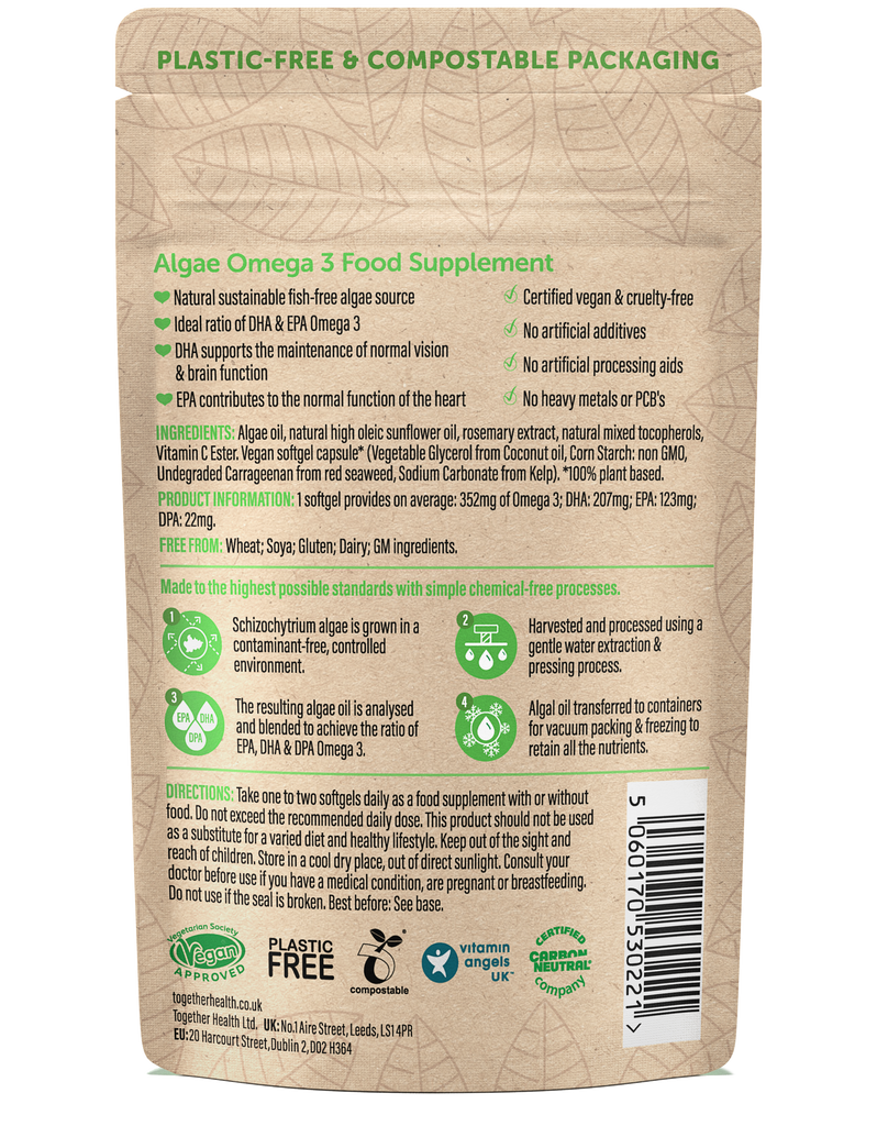 We’ve taken all the goodness from one of nature’s finest offerings and sourced our omega 3 from pure algae. We do this because algae doesn’t contain any of the nasty contaminants found in fish oil and can be done in a sustainable way.