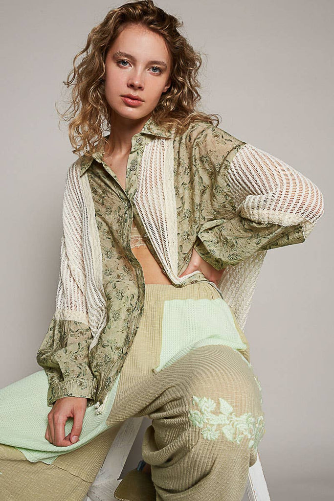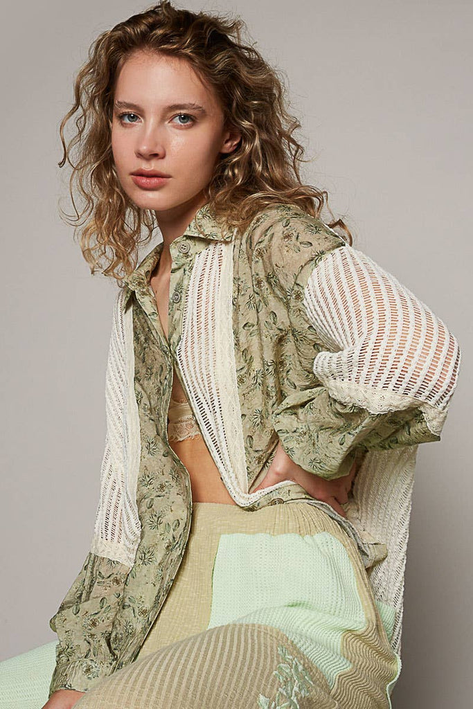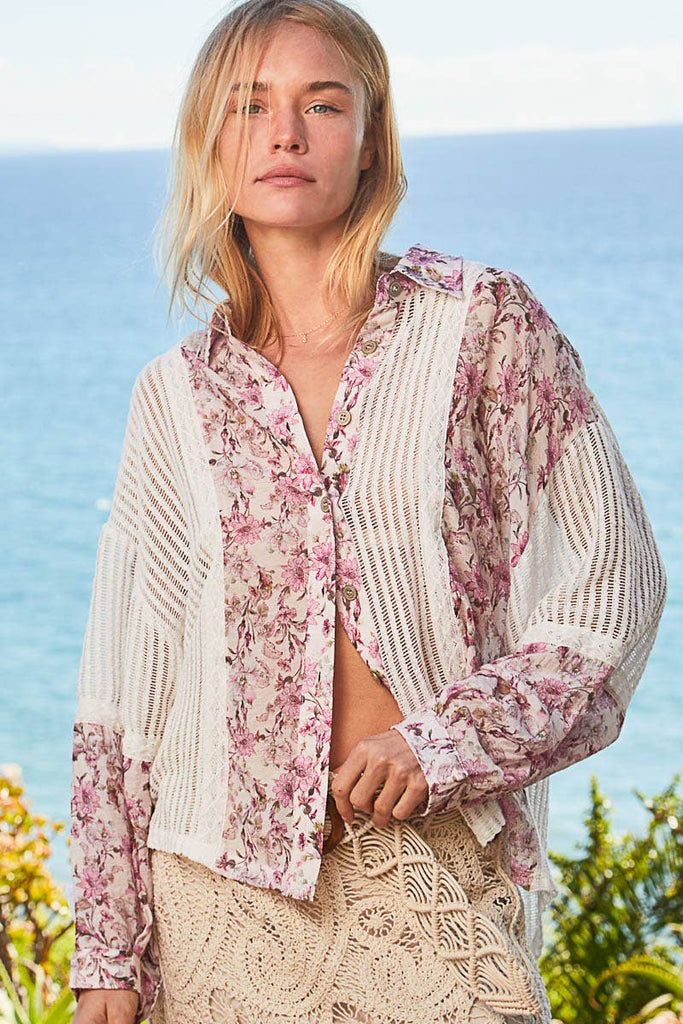 Designed in button down oversized fit long sleeve shirts in printed woven, see through crochet and trim.